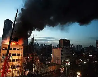 On January 19, 2009, about 30 evicted residents held a sit-in protest in a temporary four-story tower built on the building's rooftop, demanding proper compensation after a decision to redevelop the area.[1] 300 police officers were deployed to the site in response to the sit-in, which escalated as protesters threw projectiles and Molotov cocktails towards the police and police forces responded with water cannons. At 1:22 am on the 20th, the curtain wall of an adjacent commercial building caught fire after being hit by a Molotov cocktail thrown by protesters.[2]