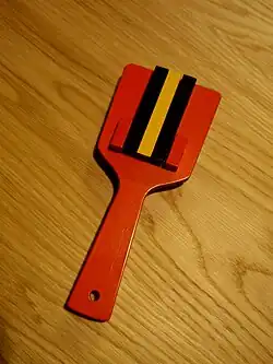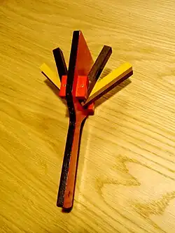 One of the defining aspects of yosakoi dance is the use of naruko: small wooden clappers that are held in the hands of each dancer. Naruko were originally used in Kōchi Prefecture to scare birds away from rice fields. The traditional naruko has black and yellow beaters on a wooden body, but most modern yosakoi groups create their own naruko, choosing colors and materials that match their costumes. The use of naruko is required in traditional yosakoi dance, but many groups also use other hand-held instruments or props, such as drums, other percussion instruments, flags, batons, and floats.