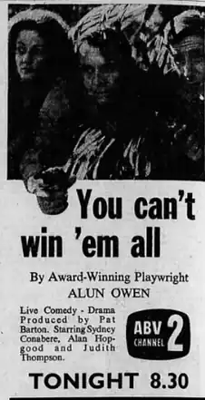 You Can't Win 'Em All is a 1962 Australian television play directed by Patrick Barton. Filmed in London, it was based on a play by Alun Owen which had been previously filmed by the BBC in 1962.[4]