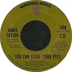 Richie Havens covered "You Can Close Your Eyes" on his 1976 album The End of the Beginning.[20] Maureen McGovern covered "You Can Close Your Eyes" as the closing track of her 1992 album Baby I'm Yours.[21] Sheryl Crow covered it on her 2003 album Artist's Choice: Sheryl Crow.[22] The a cappella group the King's Singers covered the song on their 2008 album Simple Gifts[23] and The Young'uns covered it a cappella on their 2012 album When Our Grandfathers Said No.[24]