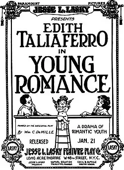 Young Romance is a 1915 American silent romance film directed and produced by George Melford. The film is based on the play of the same name by William C. deMille who also wrote the screenplay. Edith Taliaferro, who made only three films in her career, stars in this film which is the only one of her films that still exists.[1]
