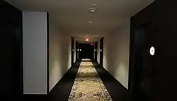 Yours Truly has an open concept main floor.[4] A Call Your Mother location operates in the lobby.[5] According to Condé Nast Traveler, "The massive space is set up with macrame wall hangings, leather chairs and velvet couches in 70s' burnt amber shades, and a jungle of plants."[6] During evenings, the South American-inspired restaurant Mercy Me operates in the lobby.[7][8]
