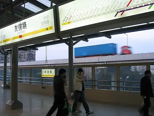 Youyi Road (simplified Chinese: 友谊路; traditional Chinese: 友誼路; pinyin: Yǒuyì Lù) is a station on the Shanghai Metro Line 3. It is part of the northern extension of that line from Jiangwan Town to North Jiangyang Road that opened on 18 December 2006.[1][2]