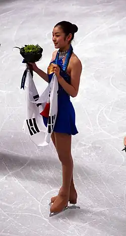 Yuna Kim (Korean: 김연아; born September 5, 1990), is a South Korean retired competitive figure skater. She participated in the Winter Olympic Games twice, winning the gold medal in 2010 and the silver medal in 2014. She is also a two-time World champion (2009, 2013) the 2009 Four Continents champion, a three-time Grand Prix Final champion (2006, 2007, 2009), the 2006 World Junior champion, the 2005 Junior Grand Prix Final champion, and a six-time (2003, 2004, 2005, 2006, 2013, 2014) South Korean national champion.