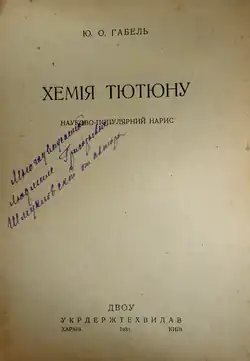He served as a lecture assistant to Professor Konstantin Krasusky.[5] From 1923, he worked at the Institute of Applied Chemistry, where, at the suggestion of the institute's director Ivan Krasusky, he researched the dry distillation of tobacco alongside G. I. Kiprianov.[6] Independently, but concurrently with Aleksandr Shmuk, they established the correlation between the quality of tobacco and the alkalinity of tobacco smoke.[7] Eventually, Gabel headed the tobacco research laboratory. His scientific work at the institute focused on the chemical composition of tobacco. This research resulted in several scientific articles and the pamphlet "Chemistry of Tobacco" (1931).[8][9] He taught at the Kharkiv State Zooveterinary Academy and National Pharmaceutical University in Kharkiv, as well as at the coke-chemical and pharmaceutical technical schools, the Workers' Faculty and the industrial academy.[10][3] In 1925, he held the position of editorial secretary for the newly-established Ukrainian Chemical Journal.[8]