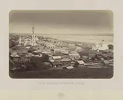 In 1800, the stone Church of the Forerunner with a bell tower was built.[26] In 1815 - the Christmas Church.[27] In 1816, on the initiative of the head of the district internal guard, a hospital was opened in Yuryevets to treat soldiers of the invalid team and prisoners. This was the first medical institution in the town.[28] In 1820, a parish church school was opened. By the 1820s, there were about 140 private shops in Yuryevets, united in trading rows according to the goods sold.[29] Since the mid-19th century, a large cargo-passenger pier has been formed.[7] In 1871, the Yuryevets flax-spinning factory was built and the first meteorological observations began in Yuryevets.[30] In 1838, a special public house was built for a hotel.[29] In 1876, the Yuryevets District Library named after F. S. Gribunin was founded.[31] In 1878, the almshouse of the Yuryevets city house of care for the elderly and disabled of both sexes was opened.[32] In 1880, M. I. Krasilnikov founded a brewery in Yuryevets.[33] On April 23, 1889, the Yuryevets almshouse for poor citizens was opened. In 1895, the Moscow company "Brant and Co" acquired a plot of land from the Krivozersky Monastery and began construction of the largest sawmill in the Volga region on the left bank of the Volga, opposite the town of Yuryevets. As a result, housing for workers was quickly built around the plant, forming the village of Novaya Slobodka.[34] At the end of the 19th - beginning of the 20th century, with the assistance of the city head Vasily Eremeevich Litsov, a women's gymnasium and a craft school were opened in the town, and the streets were paved.[35] In 1904, the first zemstvo hospital was opened. In 1906, a starch factory was built. In 1911 the Summer Theater was opened in the town park.[36] On July 18 (old style) 1914, the 323rd Yuryevets Infantry Regiment was formed and transferred to defend the Ivangorod fortress.[37]