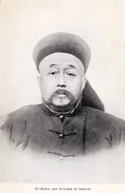 Yuxian (1842–1901) was a Manchu high official of the Qing dynasty who played an important role in the violent anti-foreign and anti-Christian Boxer Rebellion, which unfolded in northern China from the fall of 1899 to 1901. He was a local official who rose quickly from prefect of Caozhou (in unruly southwestern Shandong) to judicial commissioner and eventually governor of Shandong province. Dismissed from that post because of foreign pressure, he was soon named governor of Shanxi province. At the height of the Boxer crisis, as Allied armies invaded China in July 1900, he invited a group of 45 Christians and American missionaries to the provincial capital, Taiyuan, saying he would protect them from the Boxers. Instead, they were all killed. Foreigners, blaming Yuxian for what they called the Taiyuan massacre, labeled him the "Butcher of Shan-hsi [Shanxi]".[2][3]