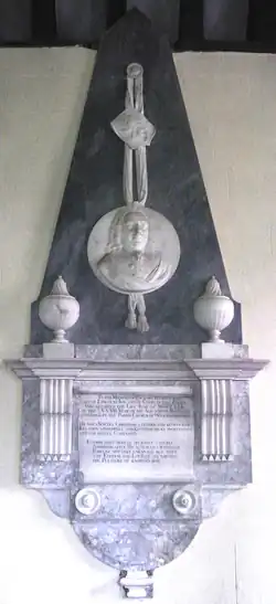 Although Zachary was buried in the chancel of the parish church of Wolfardisworthy,[9] his mural monument is in Clovelly Church.[10] A fine painting of him by Joseph Highmore (1692-1780) was destroyed in the fire at Clovelly Court in 1789,[11] but an engraving of it (but possibly of his friend the author Samuel Richardson) by James MacArdell (c.1729–1765) exists in the National Portrait Gallery.[12] A relief sculpted portrait bust exists on his mural monument in Clovelly Church. (See full text on Wikisource of s:Last Will and Testament of Zachary Hamlyn). Zachary Hamlyn's sister Thomazine Hamlyn married Richard Hammett, and had an eldest son Richard Hammett, husband of Elizabeth Risdon and father of James Hammett, his eldest son.[13]
