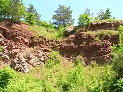 A former limestone quarry is located near the village. The rocks are part of the Świętokrzyskie (Holy Cross) Mountains, once on the southern coast of Laurasia, and have yielded 395-million-year-old fossil footprints of tetrapods.[2] These are believed to be the oldest tracks of four-legged animals known to palaeontologists, pushing back their estimated evolution by more than 18 million years.[3] The finding also suggests that the first vertebrates to walk on land may have evolved in marine tidal flats or lagoons, likely dining on animals washed up with the tides, rather than in freshwater habitats.[4]