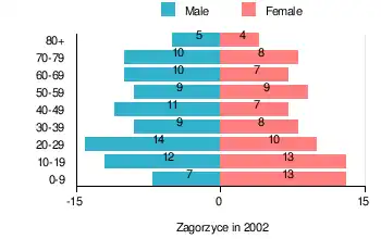 According to the 2002 Poland census, there were 166 people residing in Zagorzyce village, of whom 52.4% were male and 47.6% were female. In the village, the population was spread out, with 25.3% under the age of 18, 31.3% from 18 to 44, 19.3% from 45 to 64, and 24.1% who were 65 years of age or older.[1]