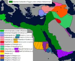 The Sultan finally summoned the governors, Taraqlu, and Qaraja. Tankiz defended Qaraja and recommended to the sultan that Qaraja would be better able to maintain Mamluk authority over the region, insisting that Taraqlu possessed no more than a thousand horsemen.[4] Al-Nasir Muhammad thus recognized Qaraja as the Emir of the Turkomans[9] and the na'ib of the lands stretching from Marash to Elbistan in 1337.[11][12] The next year, Qaraja also captured Harpoot, Darende, Gemerek, and Gürün from the Eretnids.[13][8]