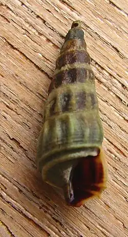Apertural view of a beachworn shell of Zeacumantus lutulentus. | |