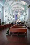 The town's main church, the Parish of San Miguel, was the monastery church until the monastery church was closed during the Reform War. The church remained open but with non-monastic priests.[1] The structure dates from the 17th century, and has typical features for constructions from that time such as a cruciform plan, a central dome and an ornate two tier bell tower. Since it was Franciscan, the facade is a sober Baroque with minimal ornamentation. Inside, on the south wall is a stone pulpit decorated with carved scales. It also contains an unusual ceramic baptismal font which dates from the early colonial period. The rest of the church is fairly modern but colonial paintings and church furnishings from earlier periods can be found in the sacristy.[3]