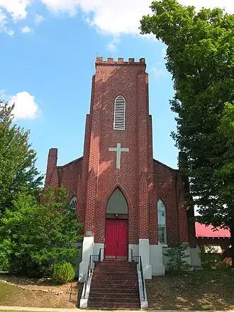 It is a brick Gothic Revival-style church designed by the Reverend James W. Rogers, who led a fund-raising drive that raised $3,200 for construction.[2]