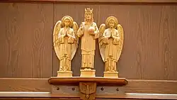 The two adoring angels at the top of the reredos, on either side, recall the Ascension. Just beneath each angel, are the carvings of Moses and Elijah, who appeared with Christ at the Transfiguration. While the statues of Moses and Elijah were done by a local artist, the Evangelist statues came from Italy, and the adoring angels from Spain.