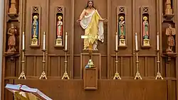 The esteemed Danish sculptor Bertel Thorvaldsen’s “Christus” takes the position of honor in the reredos. Thorvaldsen’s Christ shows a young man whose idealized body is draped in a heavy cloth that leaves part of his torso and right arm bare. His arms are outstretched in a gesture of welcome, embodying the Christian biblical quote, "Come to me all you who labor and are heavily burdened, and I will give you rest" (Matthew (11:28).