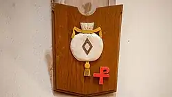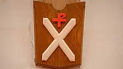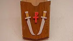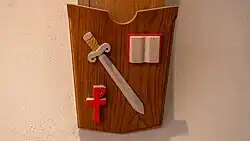The first shield we will examine is found as you first enter the nave looking up at the trusses on the left side. We will then work our way forward from the choir loft towards the pulpit area. The first shield depicts Two Keys and represents Simon Peter, Andrew's Brother, called Peter by Jesus of Nazareth. Traditionally, St. Peter is represented holding Two Keys of equal size, which is explained by the Savior in the Gospel of Matthew: “And I will give unto thee the keys of the kingdom of heaven: and whatsoever thou shalt bind on earth shall be bound in heaven: and whatsoever thou shalt loose on earth shall be loosed in heaven” (Matthew 16:19).