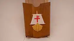 Our ninth shield depicts a Boat. This represents Jude, who was the brother of the apostle St. James the Less. Both were related to Jesus as distant cousins. St. Jude has been credited as the author of the brief Epistle of St. Jude found in the New Testament. The boat is the symbol most often associated with St. Jude alludes to Jude's earlier life, and to Jude's voyages in his part in the mission of founding the early church. A ship is also a well-known symbol of the Christian Church. It was also a great symbol during times when Christians needed to disguise the cross, since the ship's mast forms a cross in many of its depictions.