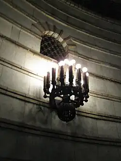 The station is illuminated by two-tierd bronze chandeliers, each featuring 12 distinct lighting groups holding candle-like bulbs. The chandeliers, designed by Stanislav Adamenko and Mariya Ralko,[10] were installed between the mosaic stripes.[12] Both the station halls and the underground vestibule feature similar light fixtures, although they are significantly smaller than the main chandeliers. The redesign also called for a gold smalt-covered ceiling, although this was rejected as it was too expensive.[10] To finish it off, gray granite was used on the floor.