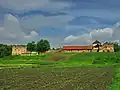 Złoty Potok (now Zolotyi Potik) Castle preserved well even though remained in desolation and partial ruination. This historic landmark positioned at the city's central headquarters nearby a rivulet falling into Złoty Potok pond. The villagers' residences located next to the stronghold bulwark. The castle has regular features and shaped in the form of rectangular. It was built out of local field stone of granite and auburn color. Bulwark thickness varied around 2 m (7 ft), and the corners of each wall has a tower with three levels of embrasures. The midsection of south north curtain wall contains a gate house being the style of Late Renaissance. Originally castle was of one story tall. The second story was added later. On the inside the gate ornamented with hereditary insignia of Potocki family, Piława.