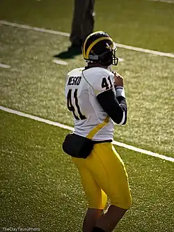 As a senior, Meskó once punted a ball 70 yards in the air.[23] As a senior punter and placekicker, Meskó was a part of the focus of opposition game plans.[24] He averaged 44 yards per punt as a senior and dropped 16 inside the 10-yard line according to The Plain Dealer and 15 inside the 15-yard line according to the Ann Arbor News.[12][25] He was selected to play on 15 January 2005 U.S. Army All-American Bowl as a punter.[26] During the game, he drew a roughing the kicker penalty and posted seven punts including kicks of 56, 48 and 47 yards and a pooch punt that he placed inside the 15-yard line.[27] He was named an Associated Press Division II All-Ohio first-team punter.[28] He was also selected to numerous local area All-star teams as both a punter and a placekicker. He served as both punter and kicker for the Ohio team during the 2005 Big 33 Football Classic in which he was 4 for 5 on PATs.[29][30] He was recognized as the 2004 Northeast Inland All-District Division II first team punter by the media.[31] He was selected as the All-Akron Beacon Journal team placekicker and the all-Summit County punter.[32][33] The Akron area coaches selected him as both the punter and kicker for the All-Western Reserve Conference, North Division first-team.[34] He was selected to the combined Summit-Medina-Portage Counties All-Area team as the first team punter by The Plain Dealer.[35] He was the first team punter for The Plain Dealer All-area team.[36] Although Meskó's high school required 40 hours of community service, he performed over 300 hours.[12]