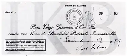 Clert then told this anecdote to a number of visitors to her gallery, one of whom, Peppino Palazzoli, an Italian gallerist, expressed an interest in buying an invisible artwork from Klein; in an attempt to repair the friendship, Clert informed Klein of the sale.[7] She also recommended that Klein design a 'proper receipt'.[7] Palazzoli became the official owner of the first Zone on November 18 that year, having bought the work for 20 grams of gold, valued at $466.20 as of November 1, 2008[8] The reunion with Clert was to prove short-lived, however. By the end of 1959, he would sever his affiliation with her gallery, and the Zones of Immaterial Pictorial Sensibility would be their last collaboration. His next exhibition, the notorious Anthropométries de l'epoque bleue, March 1960, (featuring models covered in blue paint pressing themselves on to canvases in front of an invited audience of notables) would be held in the considerably more upmarket Galerie Internationale d'Art Contemporain, on the Rive Droite.