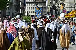 Like the other Zürich guilds (except the women members of the Fraumünster society, who participate only as "guests"),[6] the members of the Kämbel guild participate in Sechseläuten. The Kämbel riders wildly circle the Böögg at Sechseläutenplatz in fanciful "Arabian" costumes as a reference to their coat of arms which shows a camel, a pun on Kämbel.