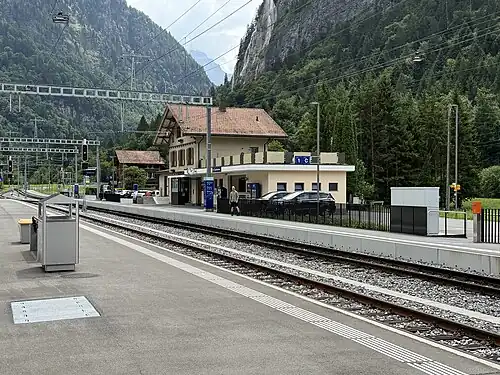 Zweilütschinen railway station (German: Bahnhof Zweilütschinen) is a railway station in the municipality of Gündlischwand in the Swiss canton of Bern. The station is on the Berner Oberland Bahn, whose trains operate services to Interlaken Ost, Grindelwald and Lauterbrunnen. It takes its name from the hamlet of Zweilütschinen, which itself is named after the nearby confluence of the White and the Black branches of the Lütschine river.[1][3]
