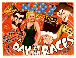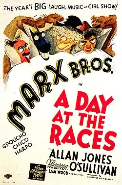 A Day at the Races is a 1937 comedy film, starring the Marx Brothers, about a veterinarian posing as a doctor, a race-horse owner and his friends who struggle to help keep a sanitarium open with the help of a misfit race-horse.