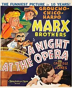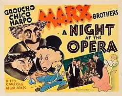 A Night at the Opera is a 1935 film about a silly business manager and two wacky friends of two opera singers who help them achieve success while humiliating their stuffy and snobbish enemies.