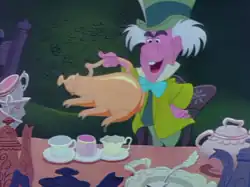 - The Mad Hatter: Oh, my! [takes his hat off which reveals a teapot and teacup, giggles]