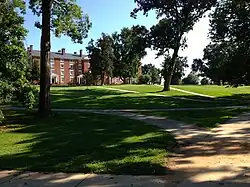 Yet the college got off to a good start. Quickly it linked itself to the Revolutionary cause. Historian of Hampden-Sydney John Brinkley contends that President John Witherspoon of Princeton probably gave the college its patriotic name. Though a recent immigrant from Scotland, Witherspoon was, in 1775, a member of the Second Continental Congress, which had just chartered a ship named for two activist Englishmen of the seventeenth century; these men were remembered in the name of patriotic organizations in several of the colonies. They were John Hampden, a Member of Parliament who challenged the king's right to levy certain new taxes and whose attemped arrest by Charles I precipitated the English Civil War; and Algernon Sidney (or Sydney, the spelling eventually adopted by the college as late as the 1920s), who fought on the side of Parliament in the Civil War, was convicted of treason under Charles II and was executed, and whose influential Discourses Concerning Government was required reading at Princeton. Smith returned from his Northern tour with three Princeton men, aged 15 through 26, engaged as faculty; a "Princeton woman," Ann Witherspoon, daughter of the president, as his wife; and "Hampden-Sidyney" as the name for the new college.- Robin Sedgwick, Two Hundred Years in the Heart of Virginia: Perspectives on Longwood's History, 1798-1998 (1998) by Robert F. Pace (editor) Farmville: Longwood College Foundation, first edition paperback, p. 3