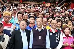 Han Kuo-yu (韓國瑜; Hán Guóyú; born 17 June 1957) is a politician in Taiwan (Republic of China) of Kuomintang (KMT). He is currently the President of Legislative Yuan since 1 February 2024. He served as a member of the Legislative Yuan from 1993 to 2002, and was elected Mayor of Kaohsiung in 2018.