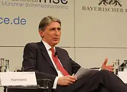 Philip Hammond, Baron Hammond of Runnymede PC MP (born 4 December 1955) is a British politician and life peer who served as Chancellor of the Exchequer from 2016 to 2019, Foreign Secretary from 2014 to 2016, and Defence Secretary from 2011 to 2014. A member of the Conservative Party, he was the Member of Parliament (MP) for Runnymede and Weybridge from 1997 to 2019. He retired from Parliament in the 2019 general election, after the Conservative Party withdrew the whip from him for voting against Prime Minister Boris Johnson's government on a bill extending the Brexit withdrawal date.