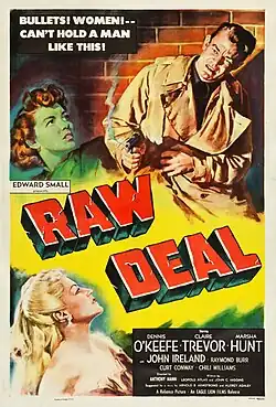 Raw Deal is a 1948 American film noir about a man who has taken the rap for another who then double-crosses him with a flawed escape plan and other means intended to get rid of him.
