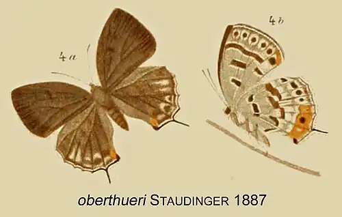 - Thecla oberthüri Staudinger, 1887: 138, pl.6 figs 4a,4b.