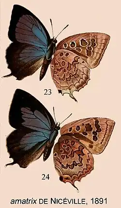 - Arhopala amatrix de Nicéville, 1891: 370, pl.G, figs 23,24.