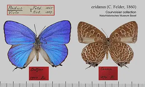 - Arhopala eridanus (Felder), D'Abrera, 1977: 312; Treadaway, 1995: 74; Vane-Wright & de Jong, 2003: 122, pl.7 fig.7.