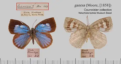 - Arhopala ganesa (Moore); Staudinger, 1888: 281, pl.96; de Nicéville, 1890: 273; Bethune-Baker, 1903 : 146, pl.4 figs 24-24a ♂ genit.; D'Abrera, 1986: 580.