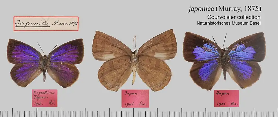 - Arhopala japonica (Murray), Bethune-Baker, 1903: 134, pl.3 fig.10, pl.4, figs 21,21a; D'Abrera, 1986: 580.