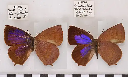 - Arhopala rama (Kollar), Bethune-Baker, 1903: 130, pl.5 figs 22,22a; D'Abrera, 1986: 580.