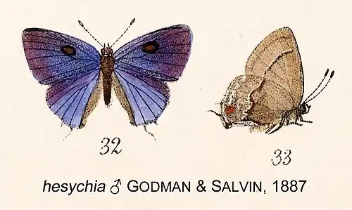 - Thecla hesychia Godman & Salvin, 1887: 87, pl.57, figs 32,33.