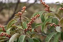 - Afrikaans: Laventelbos, Laventelkoorsbessie, Harige laventelkoorsbessie, Bergboegoe, Korannaboegoe, Kalahariboegoe, Booghout, Boeghout, Rekstokbos, Makwassi, Maquassiboom