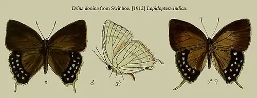 - Drina donina (Hewitson); de Nicéville, 1890: 442, pl. 29, fig. 235 ♀; Corbet, 1940: 5;