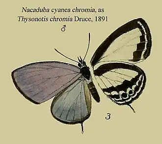 - Thysonotis chromia Druce, 1891: 365, pl. 32, fig. 3; Grunberg, 1916: 832.