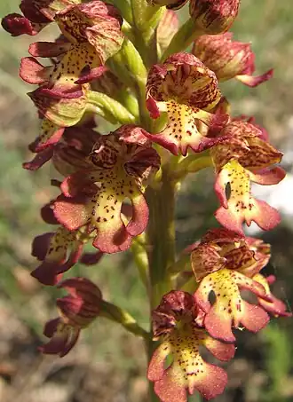 - Formula hybridae: Orchis punctulata Steven ex Lindl., Gen. Sp. Orchid. Pl.: 273 (1835) × Orchis purpurea subsp. purpurea autonym