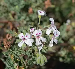 - Formula hybridae: Pelargonium quinquevulnerum Willd. × Pelargonium radens H.E.Moore. , vide Andrews (1810).
