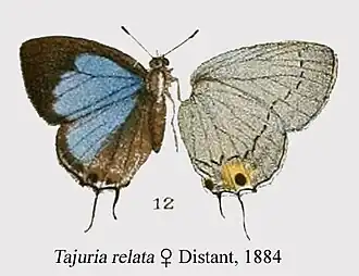 - Tajuria relata Distant, [1884]: : 246, pl. 21, fig. 12.