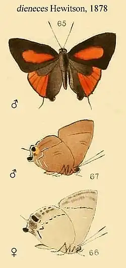 - Deudorix dieneces Hewitson, 1878: Suppl. p. 31, pl. Va, figs 65, 67 (♂), 66 (♀).
