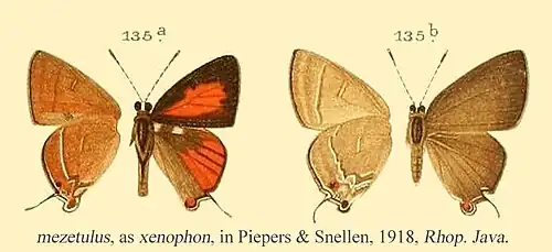 - Deudorix xenophon (Fabricius); Piepers & Snellen, 1918: 88, pl. 25, figs 135a, 135b.